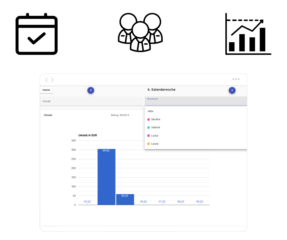 Our statistics tool allows you to plan and manage your employees’ workload in the best possible way. Using the filter function by employee, you can see exactly how many appointments each employee has and how busy they are.